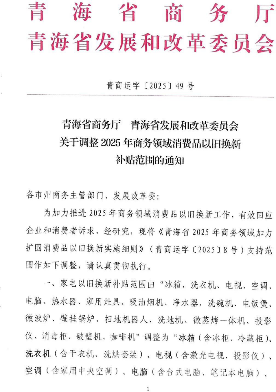 关于调整2025年商务领域消费品以旧换新补贴范围的通知